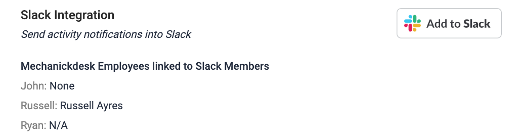 You can now map your employees in MechanicDesk to users in your Slack workspace. Assigning people here tells MechanicDesk who should receive specific notifications when required.