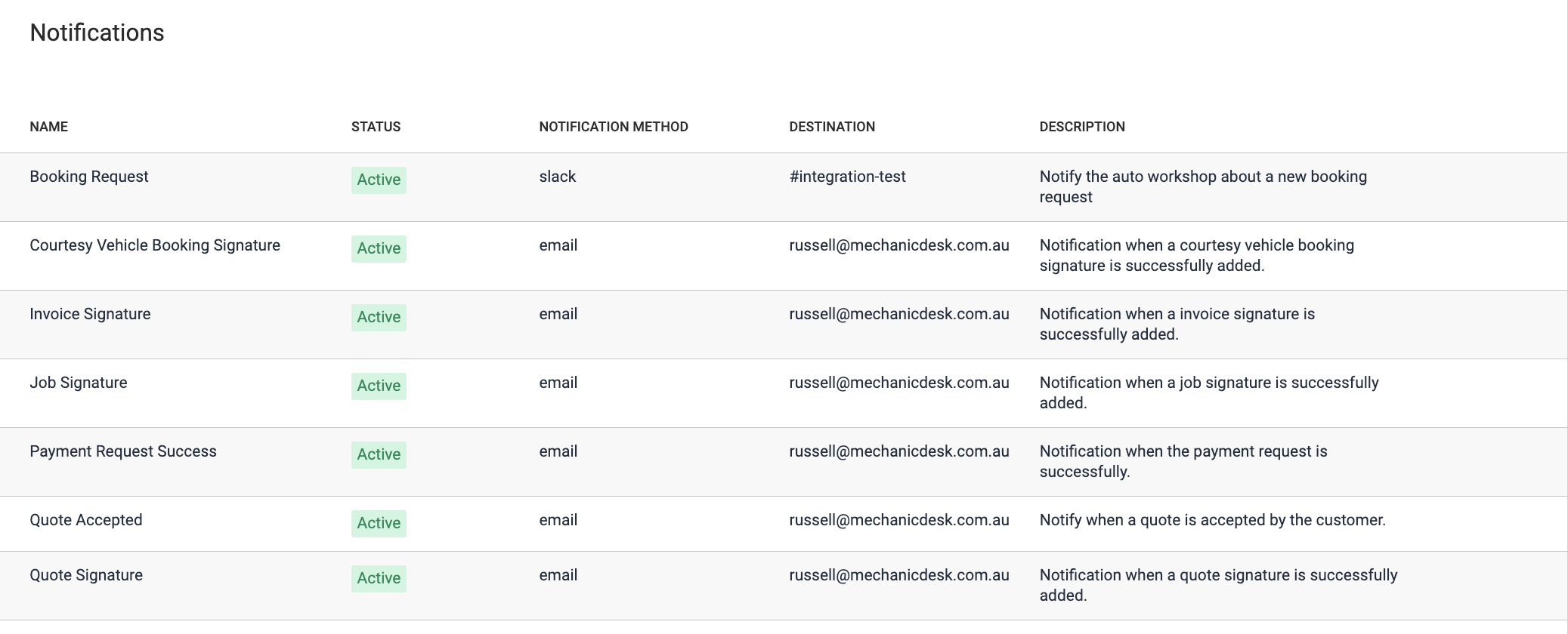 So, what can the integration do? Currently, it focuses on the notifications generated within MechanicDesk for various functions. If you go to Workshop Details → Notifications, you’ll see a list of all the notifications MechanicDesk can send and the delivery methods available.